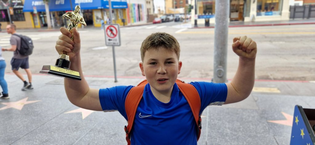 – Far / Morfar kommenterte på bloggen igår at nabobyen vår Thousand Oaks var et flott sted å besøke, så vi reiste dit i kveld. Det skuffet ikke! Lukas kjente til en svært underholdende kjede som het «Dave & Busters», og en sånnen lå tilfeldigvis i Thousand Oaks! Det ble tre kjekke timer med lek, middag og moro, og kjekke premier vi kunne ta med videre på reisen 😉