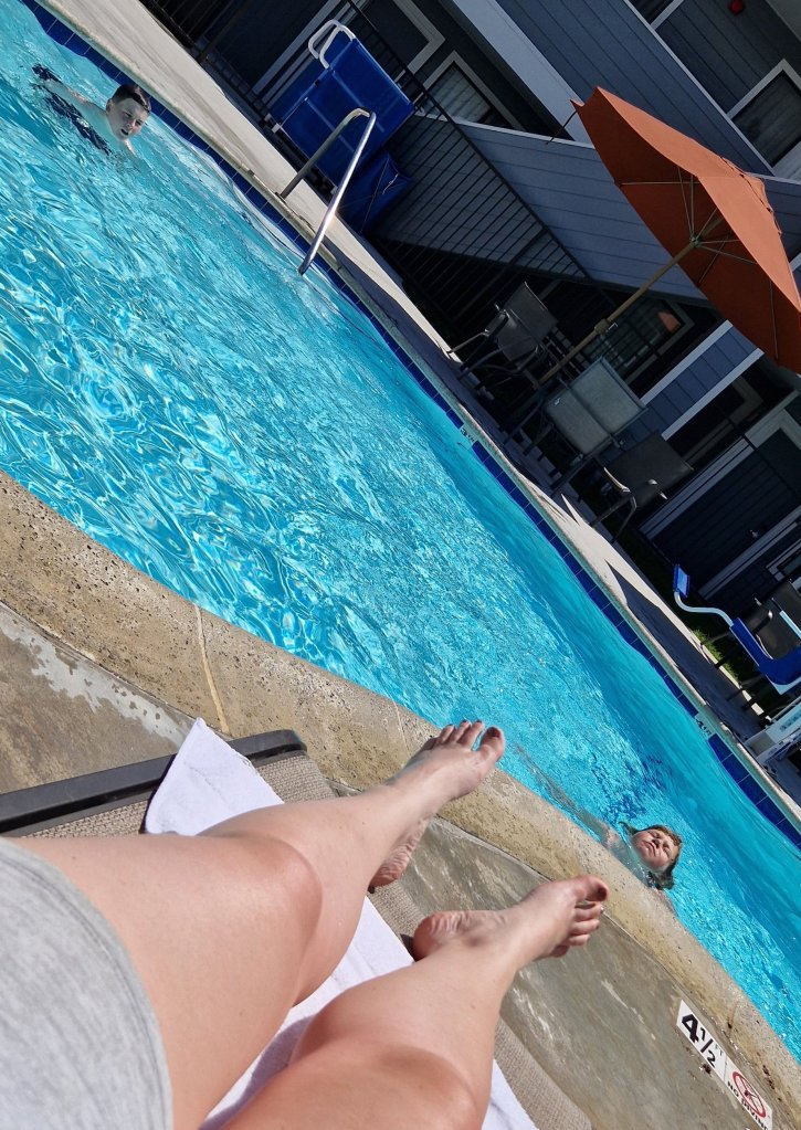 Ligge ved bassenget og skrive denne dagboken. Ungene leker bl.a. den nye leken «finish the lyrics under water!» og holder på å dø av latter!
