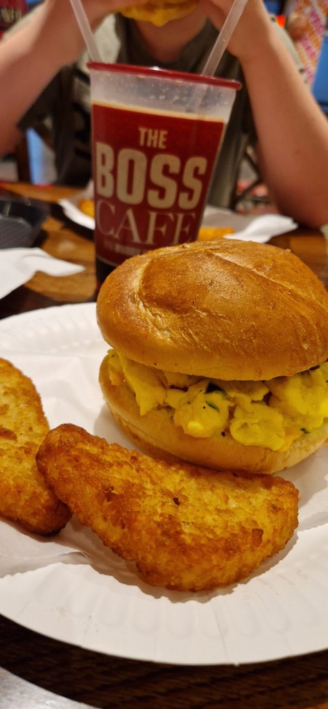 – Vi fant Cake Boss på hotellet vårt! For «nye lesere» så er det er TV-program der hjemme som heter Cake Boss på TLC. Han der cake boss’en heter Buddy, og han hadde et par utsalg i Vegas – bl.a. en frokostcafé på Linq-hotellet vårt. Veldig godt rundstykke med sausage, egg and cheese, and two hash browns 😉