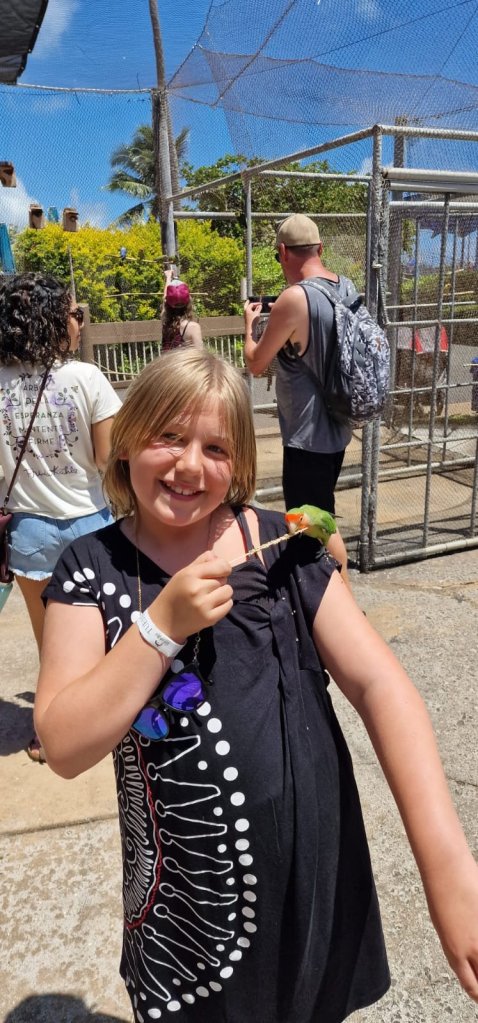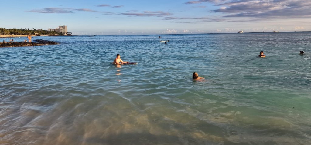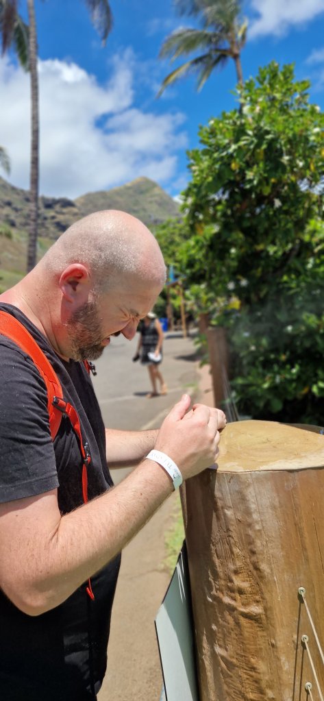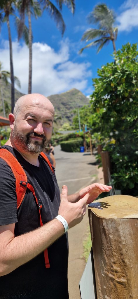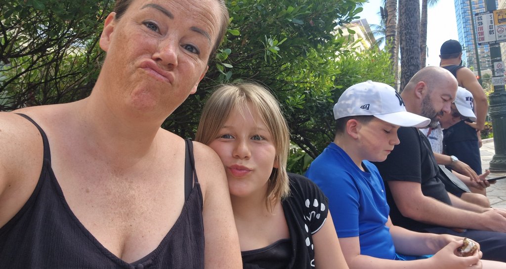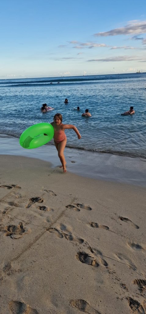 Gåing. Både rundt i Sea Life Park og til stranden på kvelden. 11300 skritt! Føtter, knær og korsrygger er slitne i kveld, og barna sovnet med en gang ørepluggene var satt inn.
