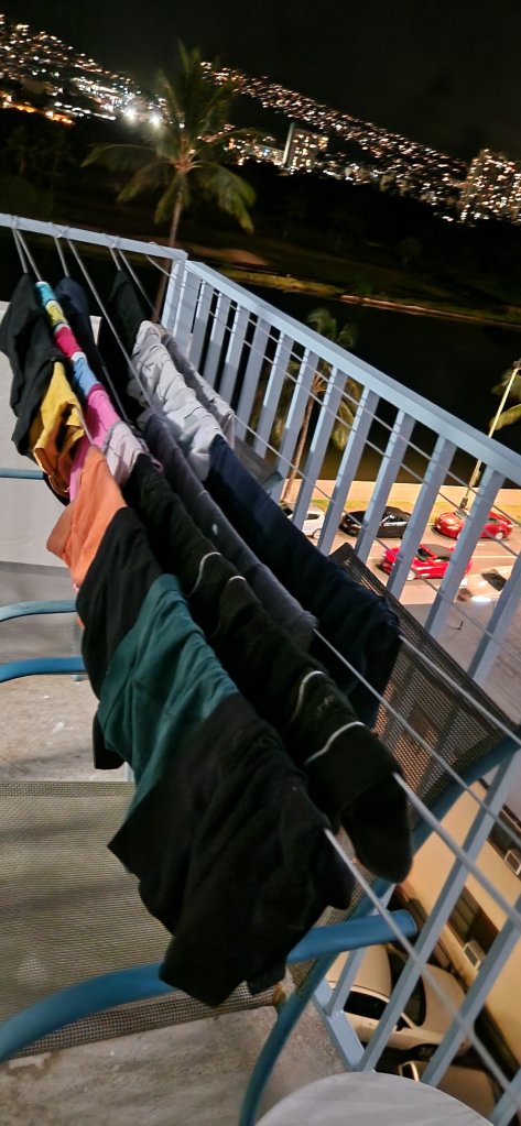 Vel hjemme igjen på hotellet var det på tide med klesvask, og Hanne fikk gleden av å henge opp den medbragte klessnoren på balkongen! Kom på at vi har glemt klesklypene, så det var ganske spennende å gå ut til middag og vedde på hvor mange halvtørka truser som lå utover gata når vi kom tilbake. Heldigvis funket det med kleshengere som klyper, så ingenting hadde fløyet avsted. Vi bor i 5.etasje, og Mor Inger ville nok vært helt enig i at det var ypperlige forhold for ute-klestørk.