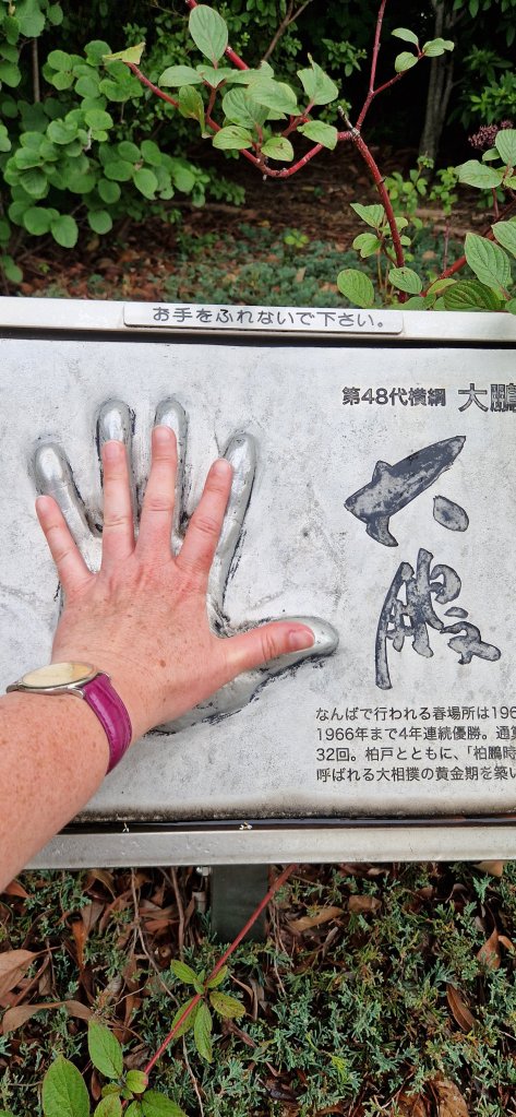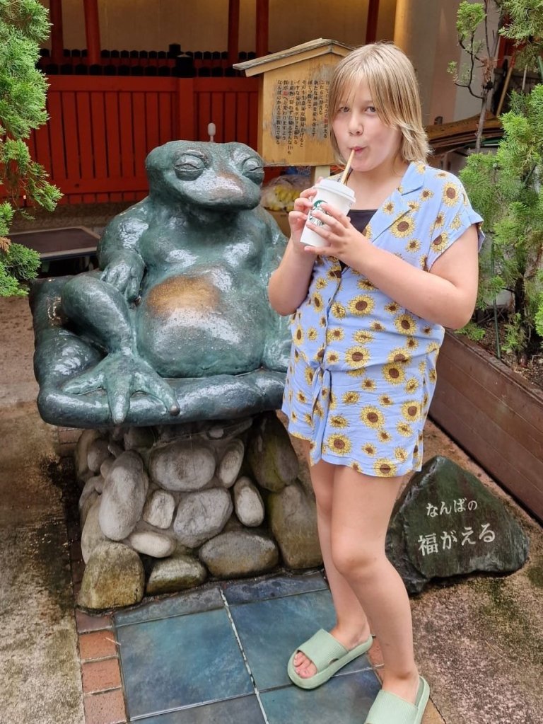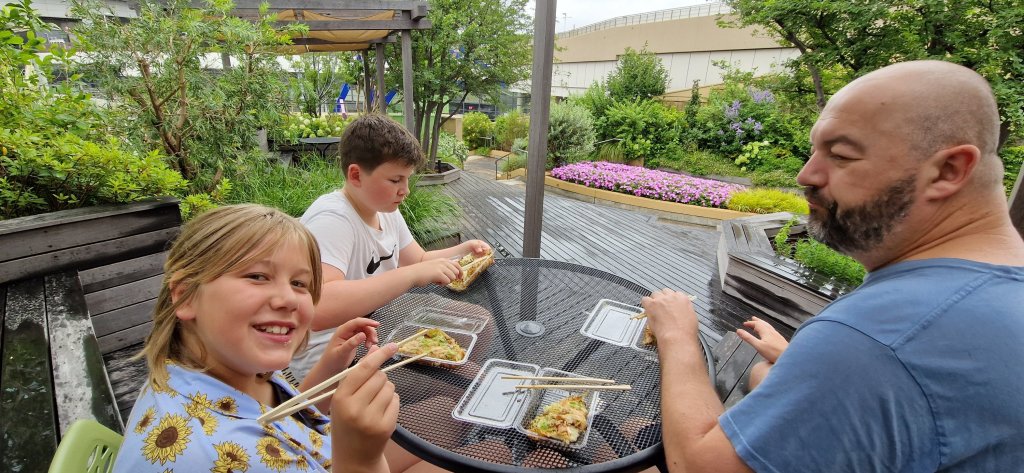Okonomiyaki til lunch, som vi spiste i den vakre hagen oppå Namba kjøpesenter. Dette var en slags pannekake med egg, kål, svinekjøtt og deilig saus. En av Astrid prest sine favoritter!