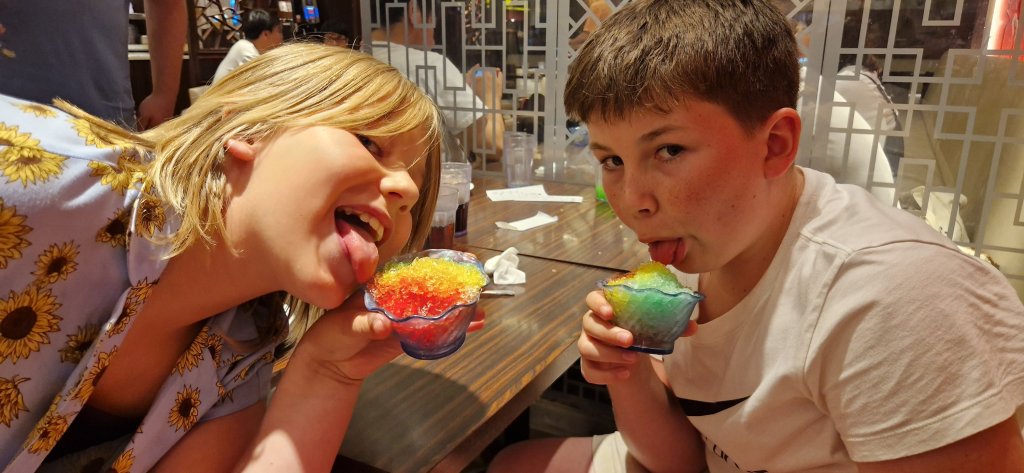 Kinamat-buffet til middag inne på Namba Parks. Der kunne vi i tillegg lage egen shave-ice til dessert! Vi spiste til vi nesten sprakk, før vi måtte ta fatt på den lange reisen hjem igjen.