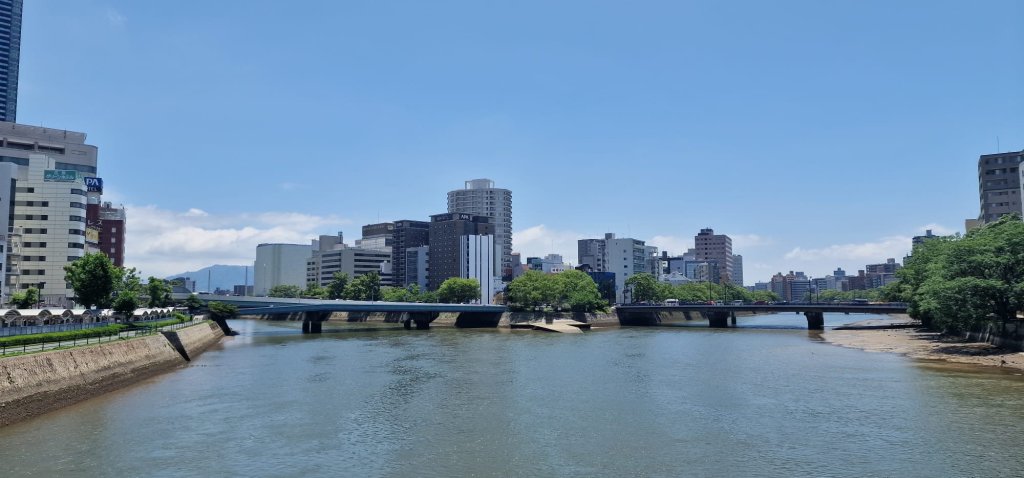 – Vi skulle spise frokost på vei til stasjonen før Hiroshima, men så fikk vi ikke tid før toget gikk. Neste løsning var å kjøpe mat på toget. Men, serveringstrallen kom aldri til vår vogn, så vi fikk ikke spist da heller! På toget fant vi en café på google maps som vi tok sikte på, og den viste seg å være en restaurant på et flott hotell ved elven. Til tross for det posh’e uttrykket var maten rimelig – og enormt god!! Vi bestilte set menu, med drikke inkludert. Viste seg å være fire retter, med salat, suppe, hovedrett og dessert! Regningen kom på kun 550kr!