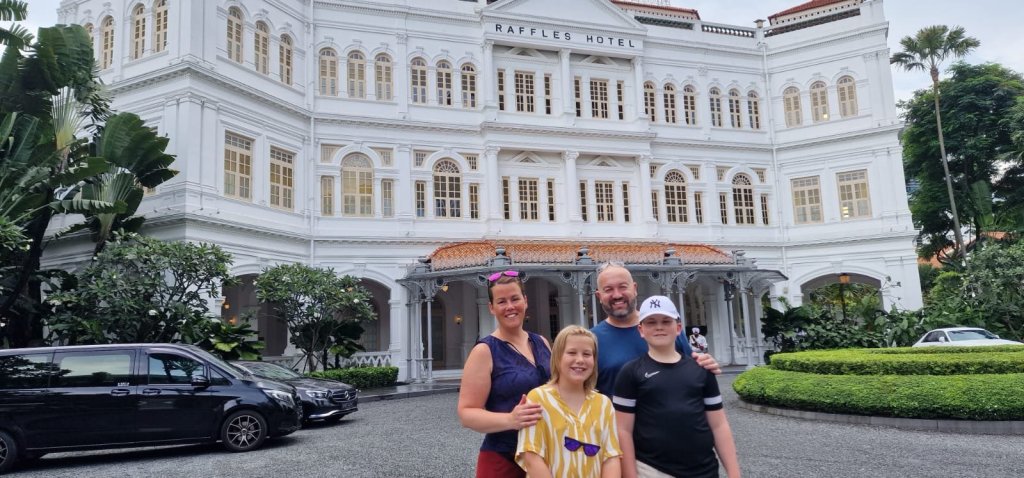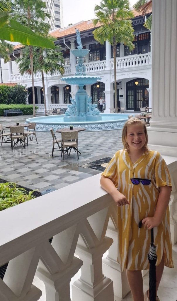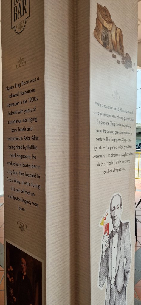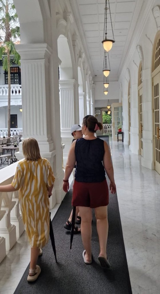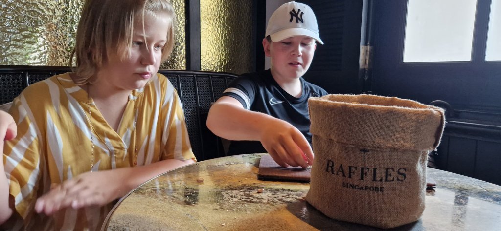 Vi tok metroen til det ikoniske Raffles hotel. Der nøt vi et par originale Singapore Sling cocktails hver, og spiste enormt mange peanøtter! Long Bar var svært koselig og flott, hotellet var magisk, det var deilige drinker (men dyre!) og morsomt å kaste peanøttskall rett ned på gulvet!