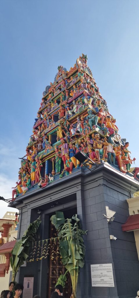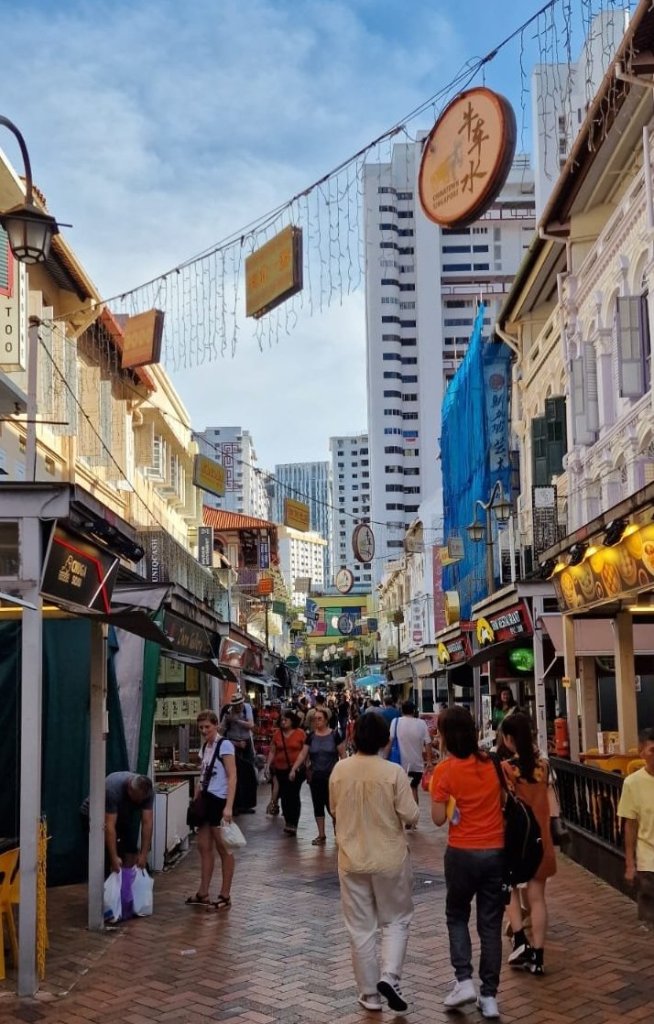 Til slutt på vår vandring gikk vi gjennom Chinatown. Stilig, eldre område! Vi kjøpte Singapore-souvenirene vår der. Takknemlige for paraplyene vi hadde med fra hotellet, for de holdt solen borte. Følte oss som fire japanske turister der vi gikk!