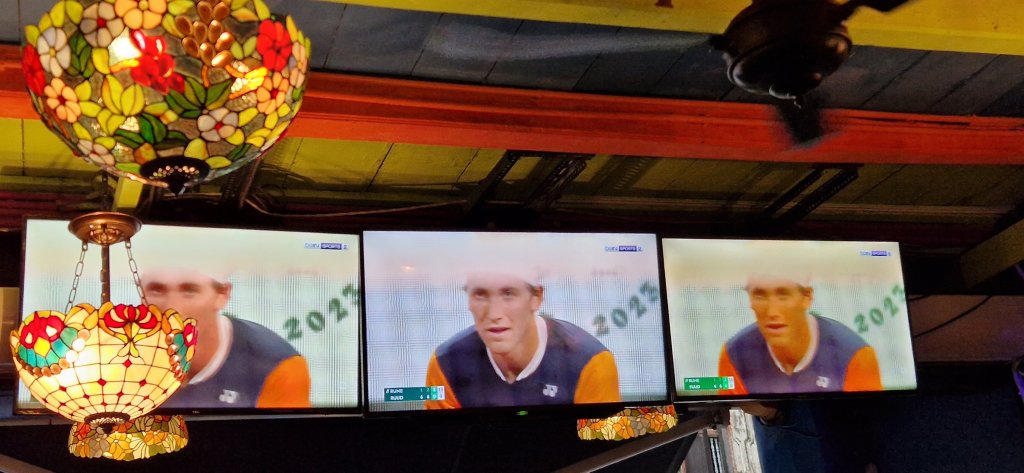 På restauranten fikk vi se tennis, med Kasper Ruud mot danske Holger Rune. Vi gikk før det var helt ferdig, men Ruud ledet!