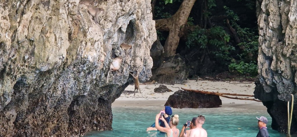 – Monkey beach. Vi gikk ikke i land her, men så mange apekatter som klovnet seg til for turistene. Noen andre båter kastet mat (og brus!?!!) til dyrene. Dette med å gi apene brus er kanskje underholdende, men hvor kaster apen flaska etterpå?