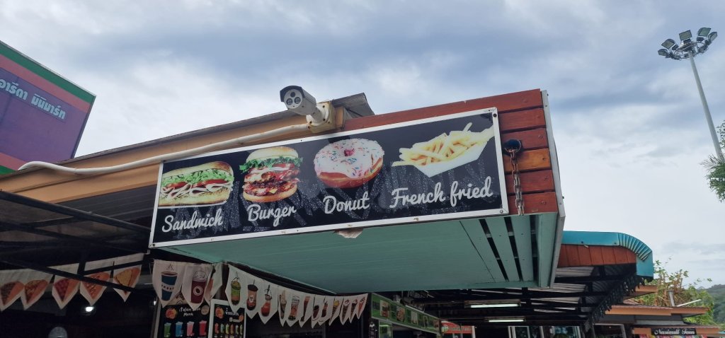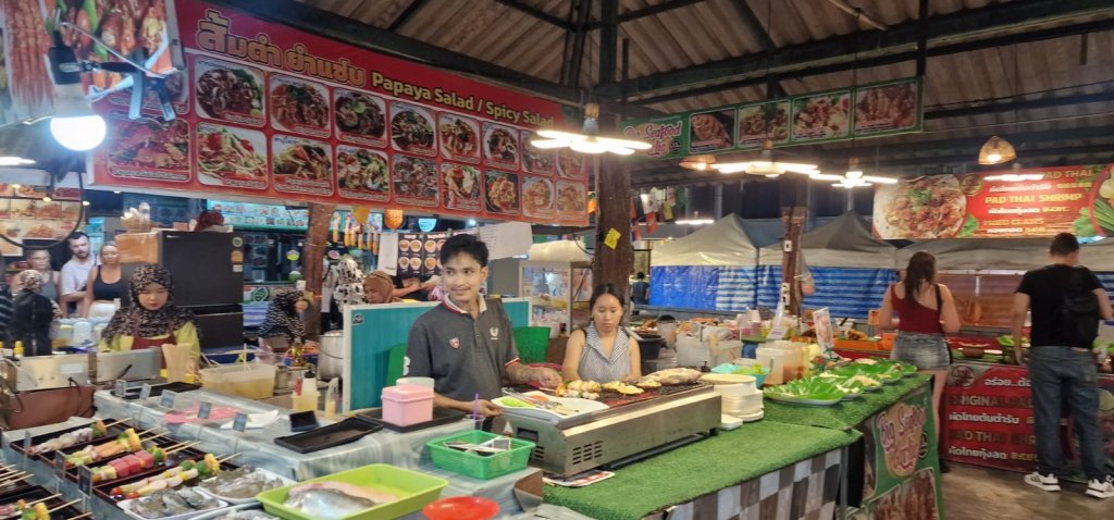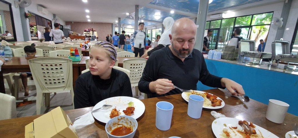 – Phi Phi Don har mange hoteller og feriehus, restauranter og butikker, så vi stoppet her for å spise lunch. Vi vandret litt rundt før vi slo oss ned på en primitiv buffet-restaurant. Billigste måltidet vi har hatt til nå i Thailand. Hele serviset var av gjenbruks-plast, maten var halal og vegetar, både sterk og mild, og vi reiste oss mette fra bordet.