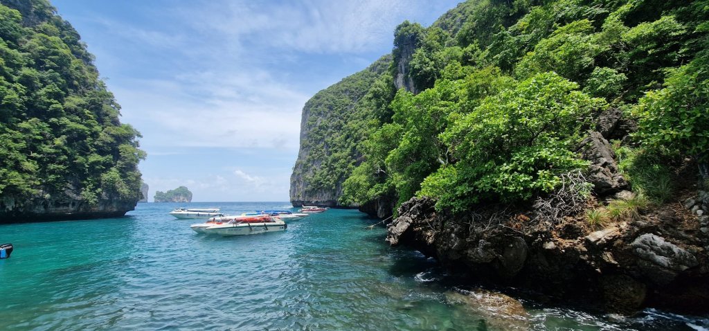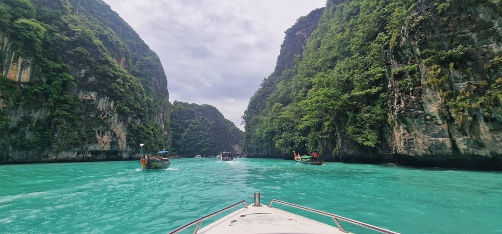 – Pileh Lagoon. Båten kjørte oss inn en nydelig turkis lagune, rett rundt hjørnet fra Maya bay. Her badet vi fra båten og fikk varmet oss opp igjen etter det friske regnet. Klippene som omfavner disse lagunene er helt magiske!