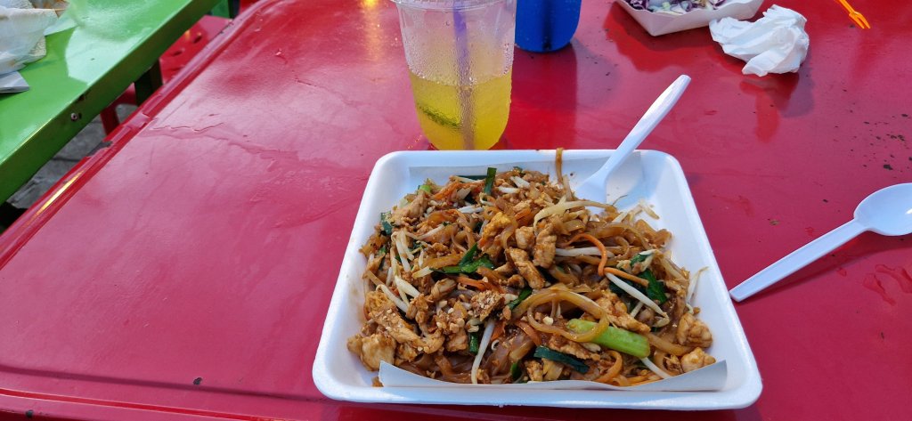 Padthai, kyllingburger, potetskrue, slush, rulleiskrem.