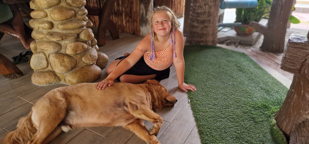 Middagen nøt vi på naborestauranten til høyre. Der møtte Mia hunden Captain, som elsket å bli klødd på magen. Mia fikk derfor tilfredsstilt litt av savnet etter Nugz..