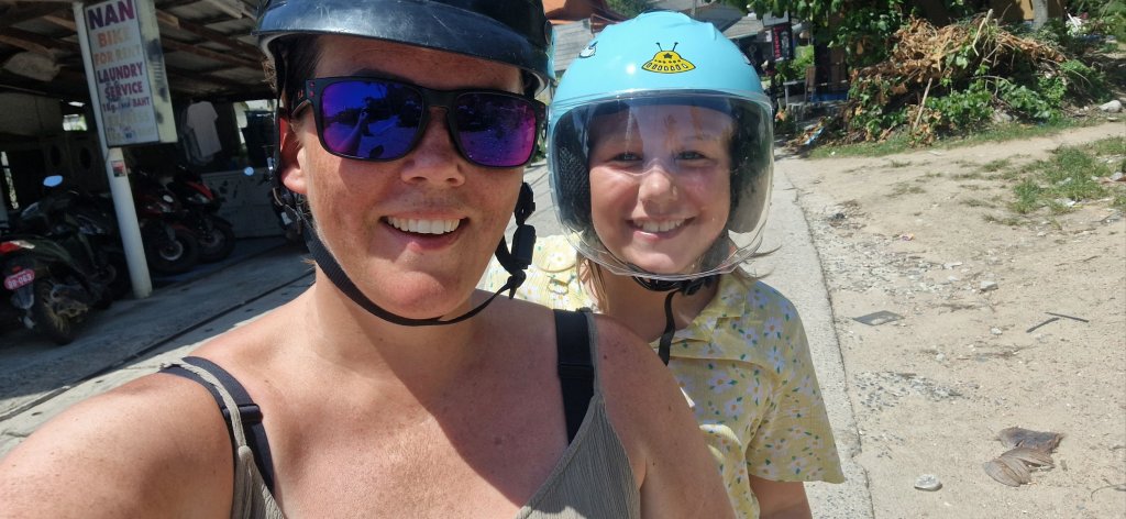 Takknemlig for hjelmer. Stolt av å bruke dem! Helt meningsløst å kjøre uten. På den korte kveldsturen telte vi 29 scootere og kun 3 av dem hadde hjelm.