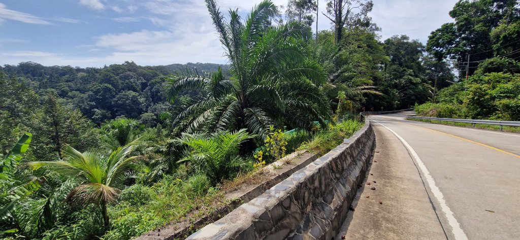 Utsikten fra scooteren, både når vi så strender og når vi så jungel. Veiene var av typen 12% bratt-opp og 8% bratt-ned og-så-opp-igjen at vi var ganske høyt oppe over trærne noen ganger!
