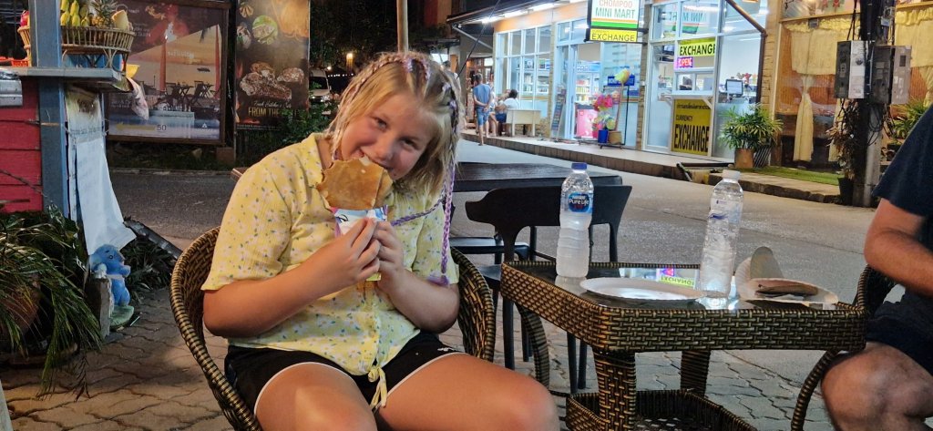 Ved ankomst Haad Rin var det kokvarmt så de voksne hoppet i havet. Dessverre var vannet like varmt som lufta, så det hjalp nesten ikke.