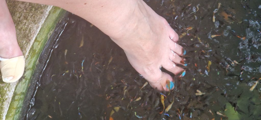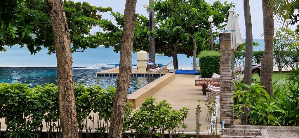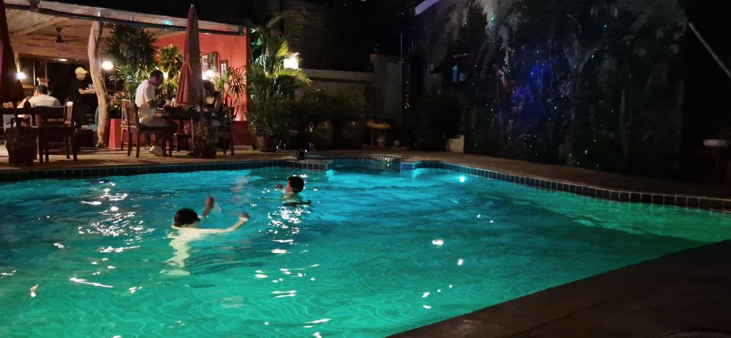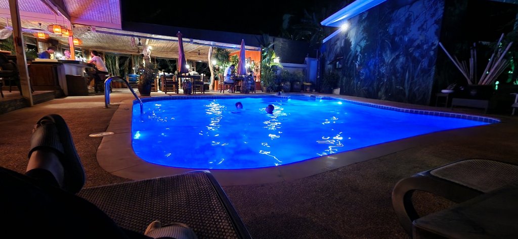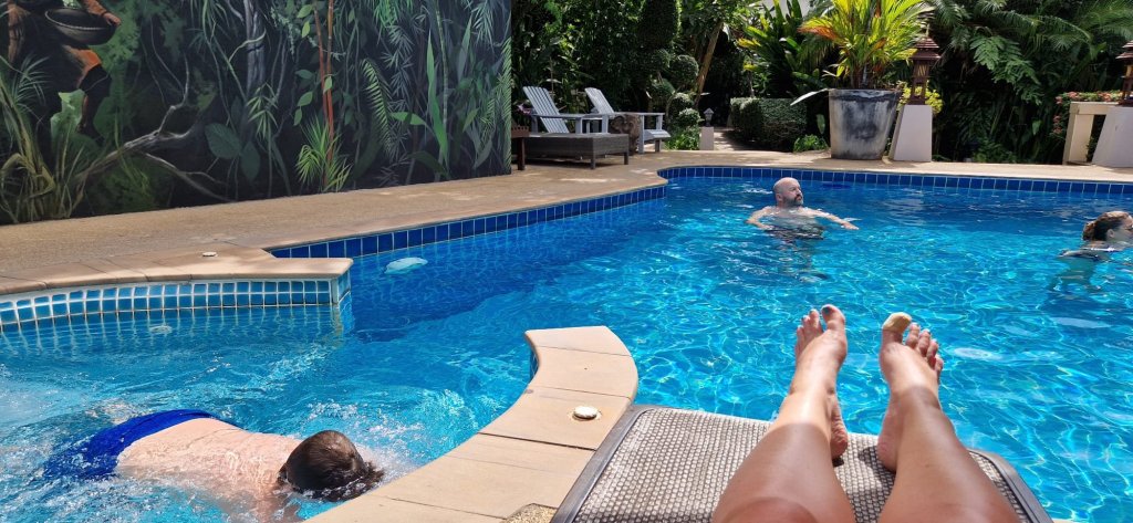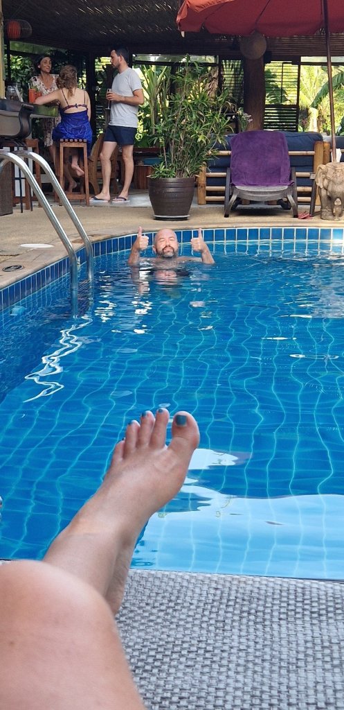 – Bassenget på Koh Phangan-hotellet ble endelig renset idag, rett før vi skulle dra, etter at det var skikkelig ekkelt skittent noen dager. Delfinene i bunn av bassenget var knapt synlige, og håret ble til seige strå med en gang vi dukket under.