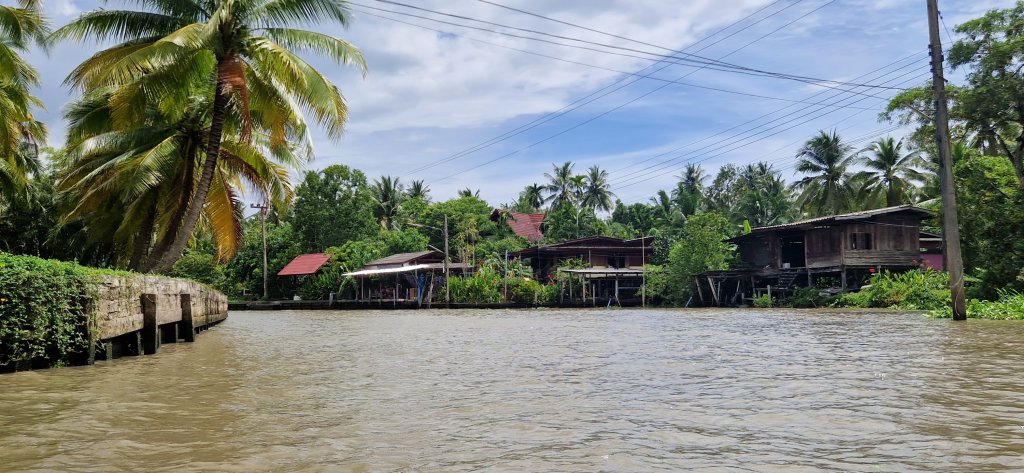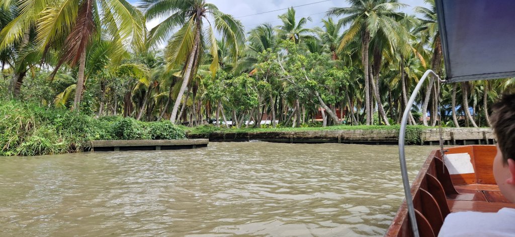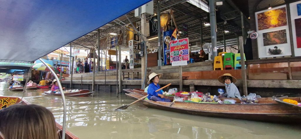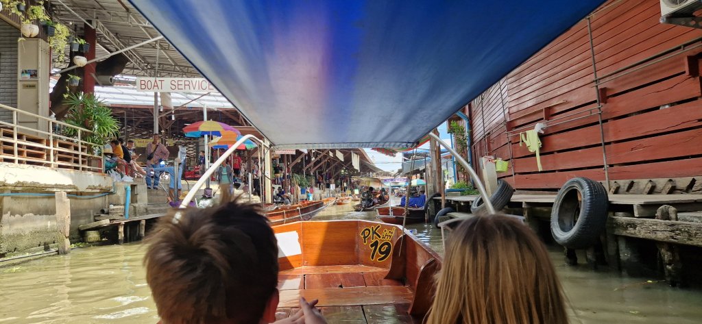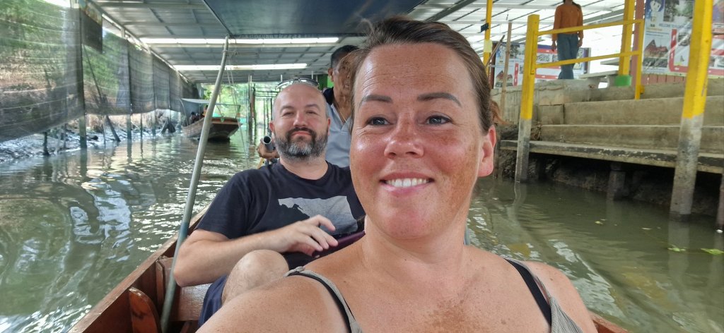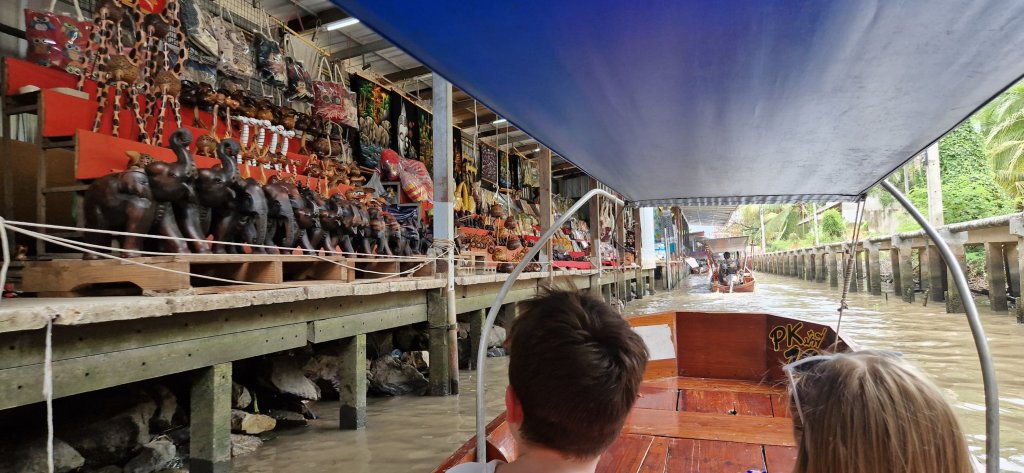 Han kjørte oss til en båt, som tok oss med på en lang rundtur i smale kanaler, langs boder med både mat, pynt, klær og masse dilldall.