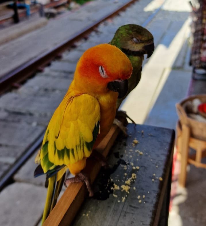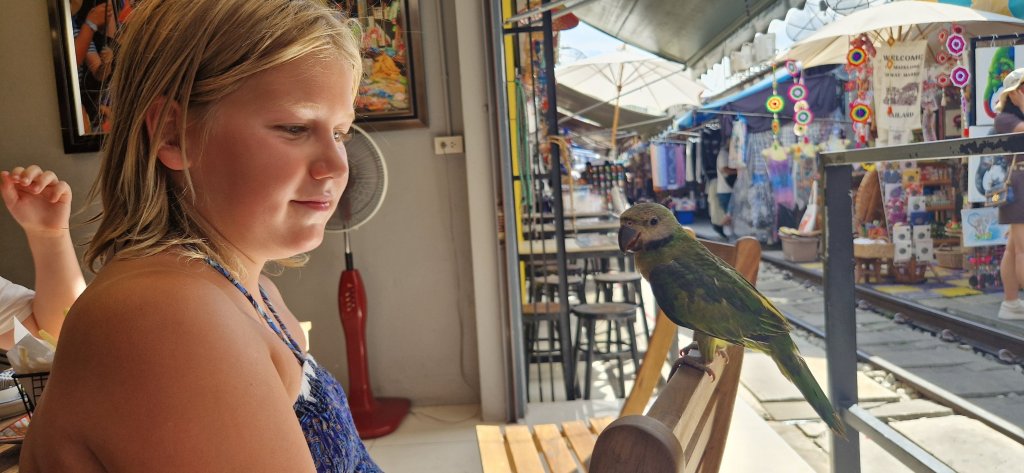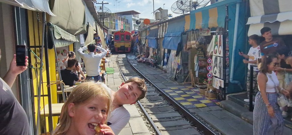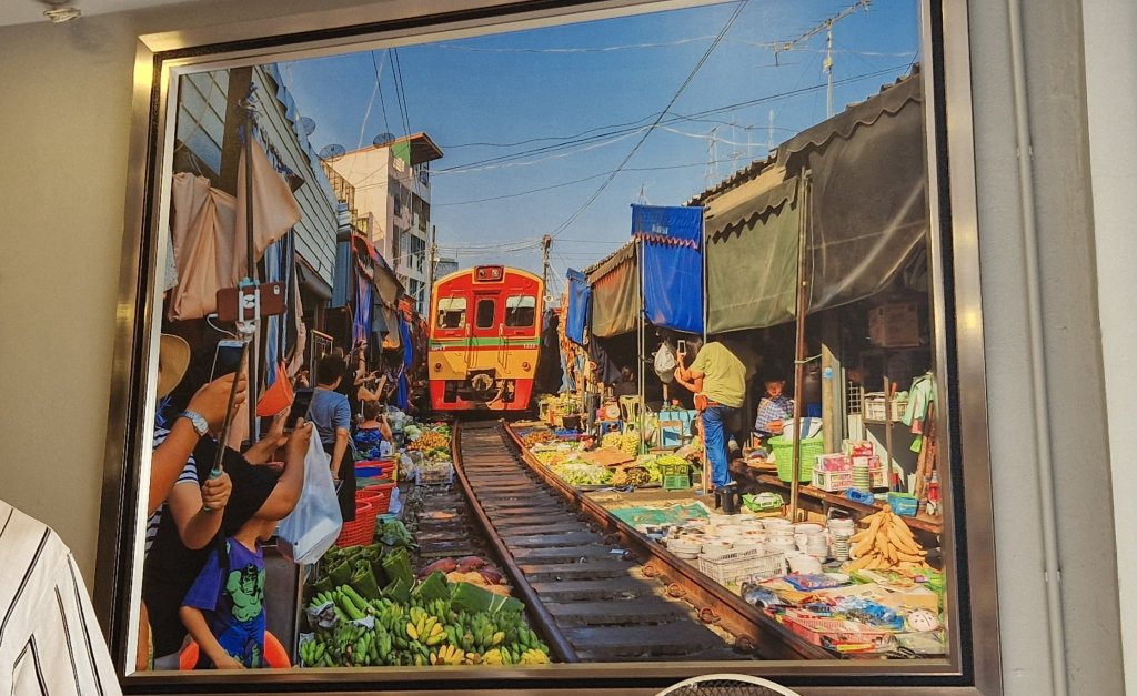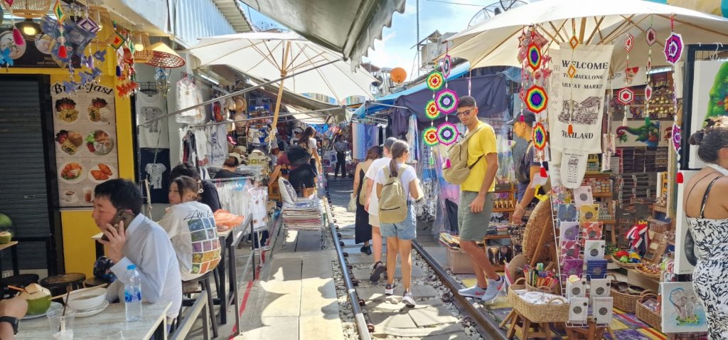 Dette er et marked tett inntil og oppå togskinnene, og omlag fem ganger pr dag går toget forbi. Da må hele markedet trekke seg tilbake og gi plass, og så fort toget er borte kommer bodene frem igjen.