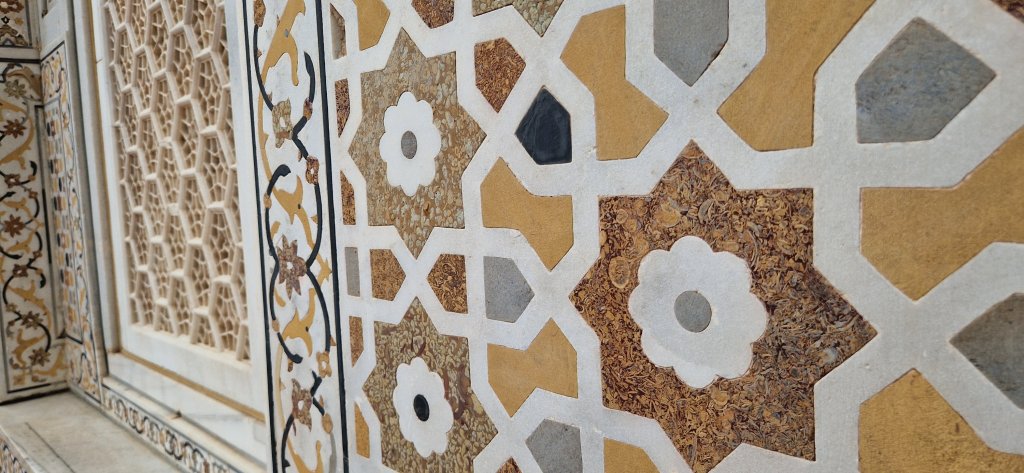 Et helt nydelig bygg, med intrikate utskjæringer i marmor. Fargene på bygget kommer fra halvedelsteiner som er blitt kuttet og slipt til å passe inni utskjæringene. Inni er det både malerier og stein. En enorm kunst og stort arbeid!