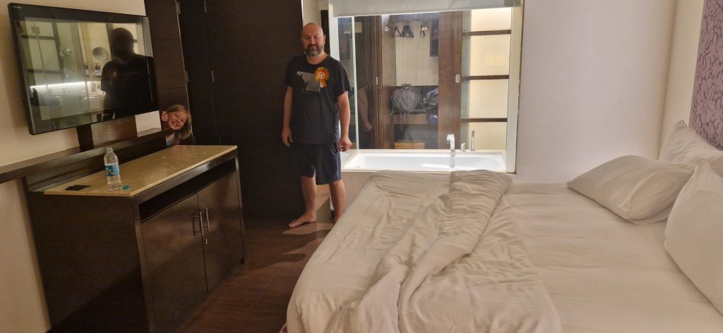 Takknemlig for badekar på rommene våre i Jaipur. Begge kids badet før leggings.