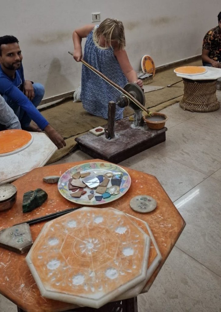 – The Marble Palace: Marmor-butikken. Der møtte vi etterfølgerne etter arkitektene som designet bl.a. Taj Mahal. Her jobber de når de restaurerer og vedlikeholder alle de flotte byggene. Vi fikk sett og prøvd teknikken for å slipe steiner, og en grundig omvisning i butikken. Vi kjøpte et lite sjakkbrett-bord og noen små runde coasters til å ha under glass på bordet (hva søren heter det på norsk?? Brikker?)