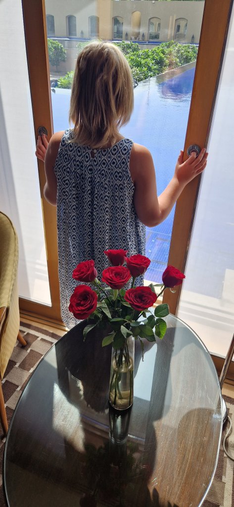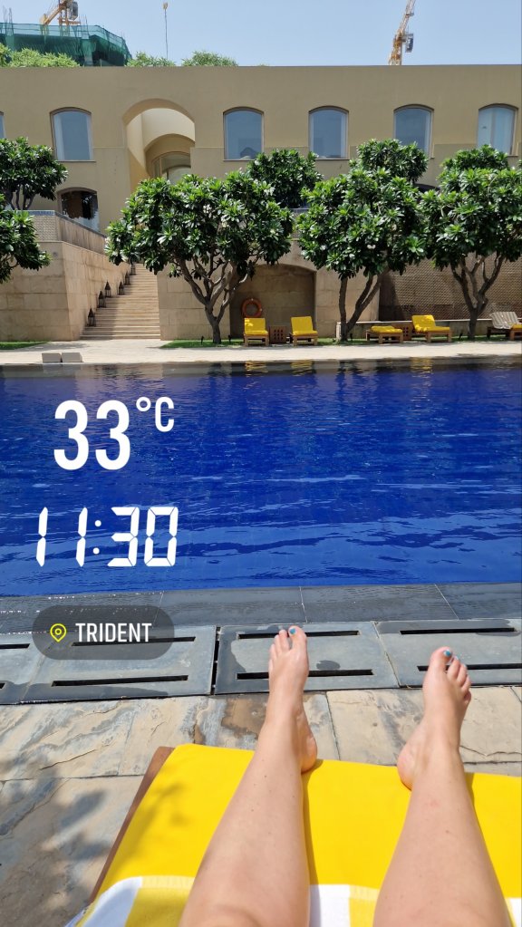 Hanne lå i og ved bassenget i fem timer imens Mark byttet mellom basseng og rommet med AC.
