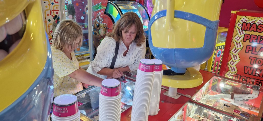 Maskinene spyr ut små billetter, som tilslutt byttes inn i Haribo og frisbee og sånn. Veldig kjekt konsept, og de fleste hadde det veldig gøy. Grandad og mummy hadde det moderat gøy.